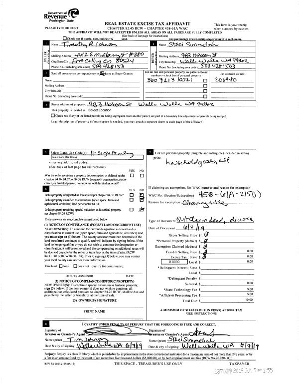 | 1 | 06/07/2019 | QCD | QUIT CLAIM DEED | JOHNSON TIMOTHY R | JOHNSON STACI M SIMMELINK | | | $0.00 | 137039 | 2019-03944 |