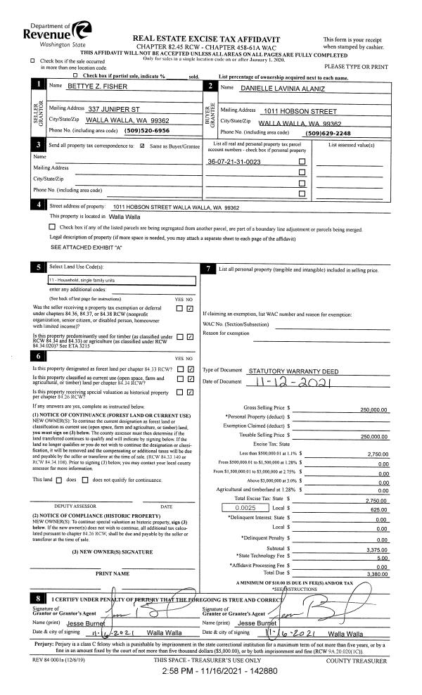 | 1 | 11/16/2021 | SWD | STATUTORY WARRANTY DEED | FISHER SUSAN & KAREN LAVINIA ALANIZ | ALANIZ DANIELLE LAVINIA | | | $250,000.00 | 142880 | 2021-13650 |