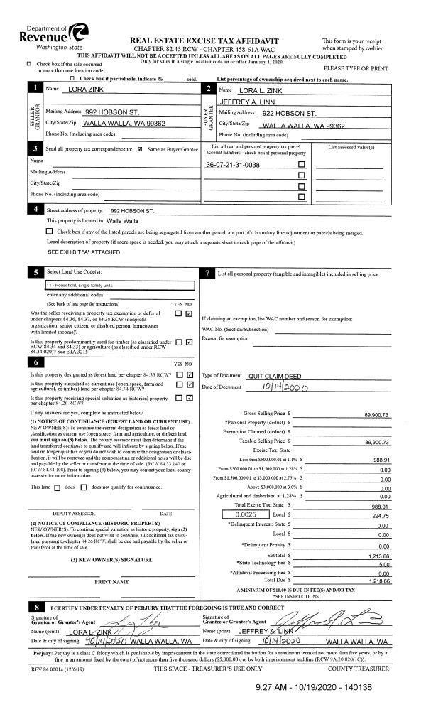 | 2 | 10/19/2020 | QCD | QUIT CLAIM DEED | ZINK LORA | ZINK LORA L & JEFFREY A LINN | | | $89,901.00 | 140138 | 2020-10793 |