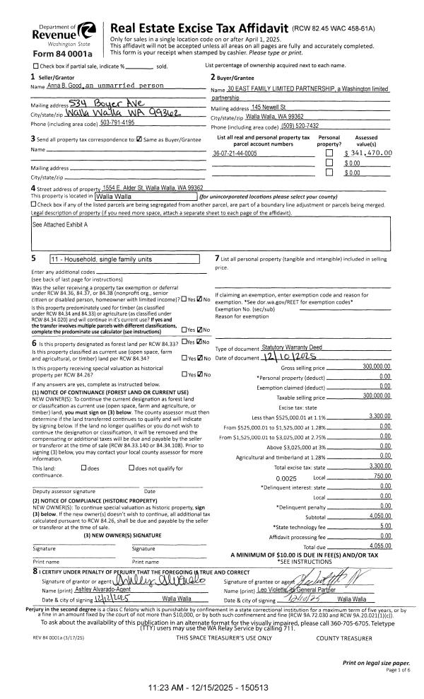| 1 | 12/15/2025 | SWD | STATUTORY WARRANTY DEED | GOOD ANNA B | 30 EAST FAMILY LIMITED PARTNERSHIP | | | $300,000.00 | 150513 | 2025-07670 |