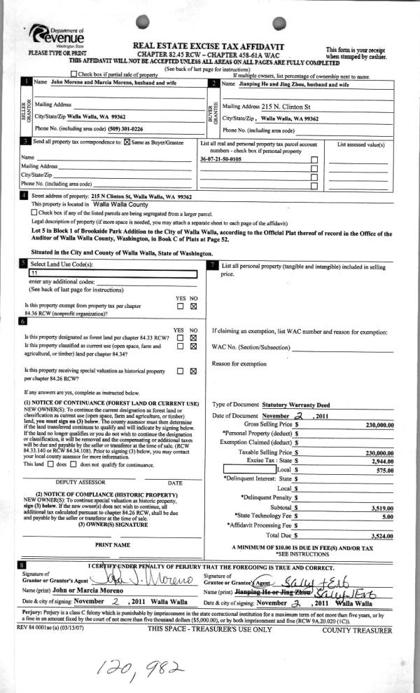| 2 | 11/15/2011 | WARRANTY D | WARRANTY DEED | MORENO, JOHN J & MARCIA L | HE, JIANPING | | | $230,000.00 | 120982 | 2011-08961 |