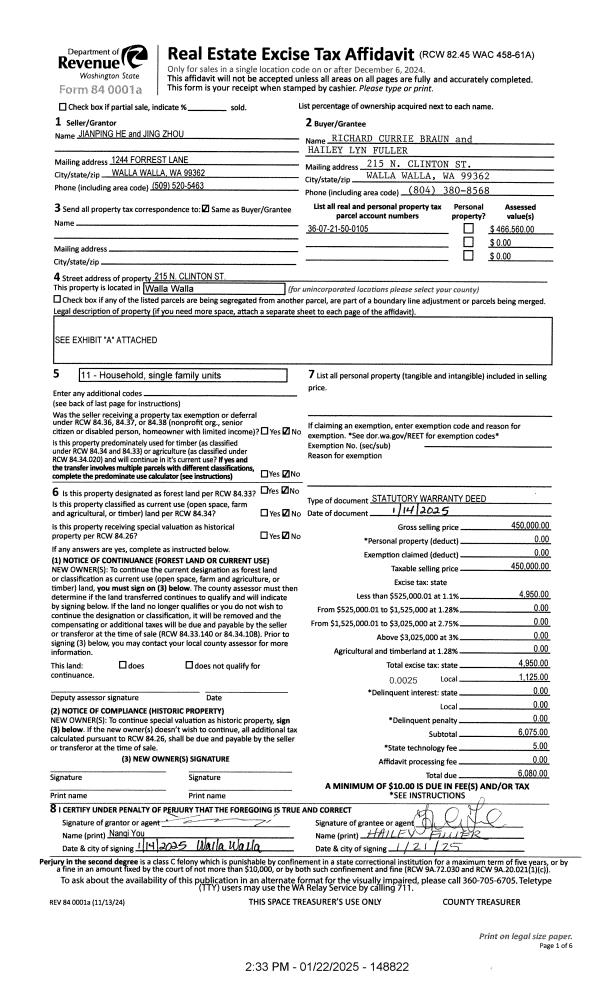 | 1 | 01/22/2025 | SWD | STATUTORY WARRANTY DEED | HE JIANPING | BRAUN RICHARD CURRIE & HAILEY LYN FULLER | | | $450,000.00 | 148822 | 2025-00362 |
