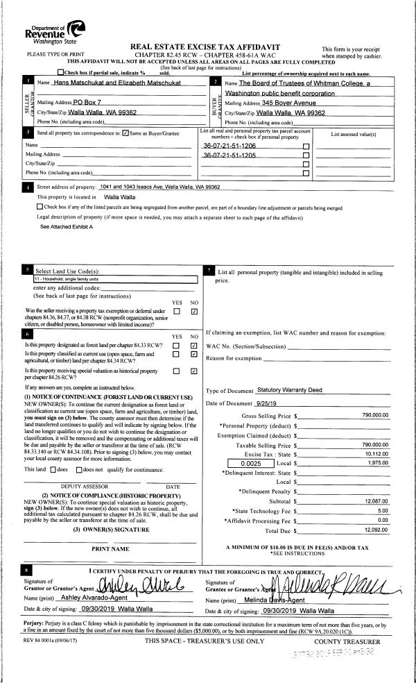 | 1 | 09/30/2019 | SWD | STATUTORY WARRANTY DEED | MATSCHUKAT HANS & ELIZABETH | WHITMAN COLL BOARD OF TRUSTEES | | 2-PARCELS | $790,000.00 | 137792 | 2019-07741 |