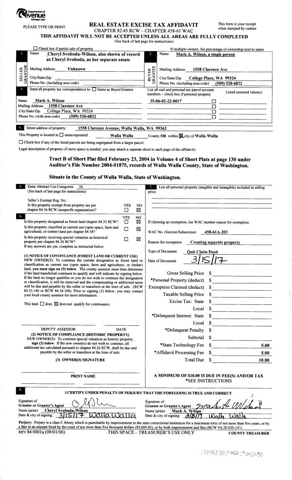 | 2 | 03/15/2017 | QCD | QUIT CLAIM DEED | WILSON MARK A | WILSON MARK A | | | $0.00 | 132062 | 2017-02053 |