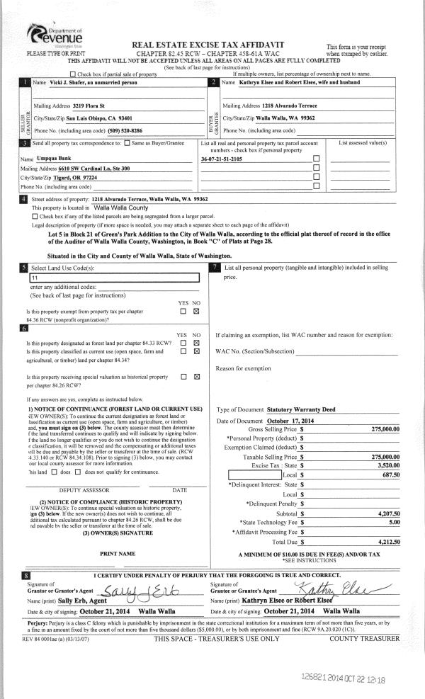| 1 | 10/22/2014 | SWD | STATUTORY WARRANTY DEED | SHAFER VICKI | ELSEE ROBERT & KATHRYN | | | $275,000.00 | 126821 | 2014-07724 |