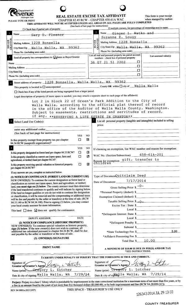 | 2 | 07/29/2014 | QCD | QUIT CLAIM DEED | FLEENOR GARY D | FLEENOR GARY D LIFE ESTATE | | | | 126343 | 2014-05361 |