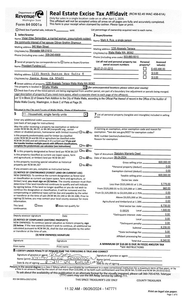 | 1 | 06/26/2024 | SWD | STATUTORY WARRANTY DEED | SEMERDJIAN VIVIAN ELISE | RUIS MARK A | | | $600,000.00 | 147771 | 2024-03400 |