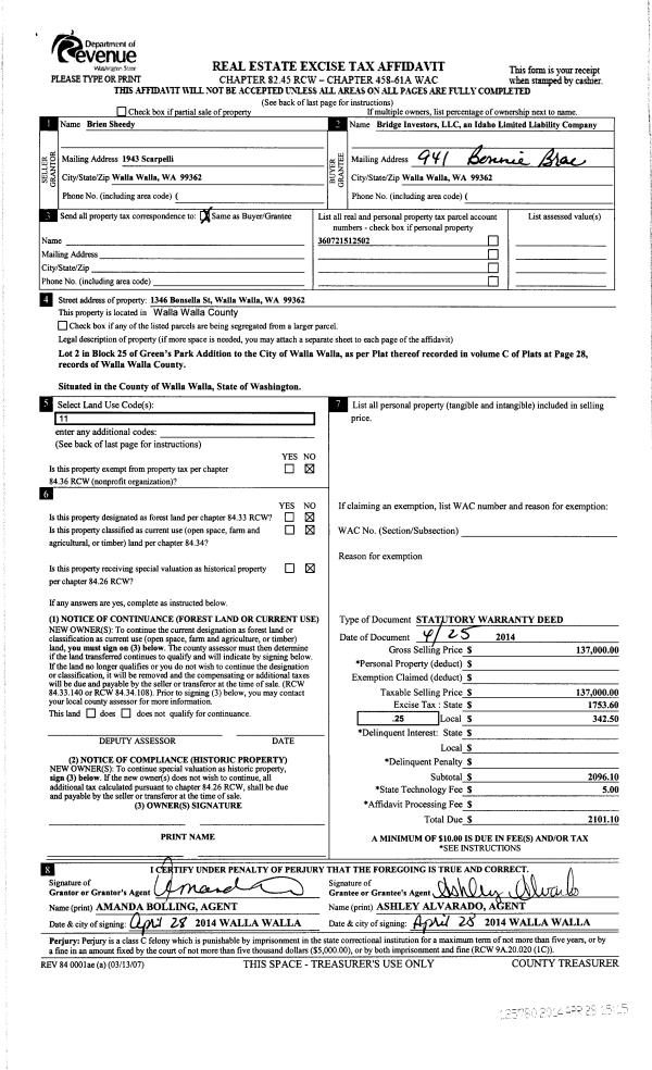 | 3 | 04/28/2014 | SWD | STATUTORY WARRANTY DEED | SHEEDY BRIEN | BRIDGE INVESTORS LLC | | | $137,000.00 | 125780 | 2014-02852 |