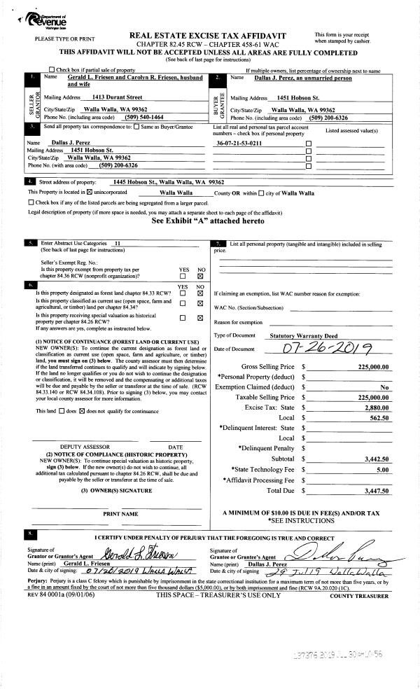 | 1 | 07/30/2019 | SWD | STATUTORY WARRANTY DEED | FRIESEN GERALD L & CAROLYN R | PEREZ DALLAS | | | $225,000.00 | 137376 | 2019-05576 |