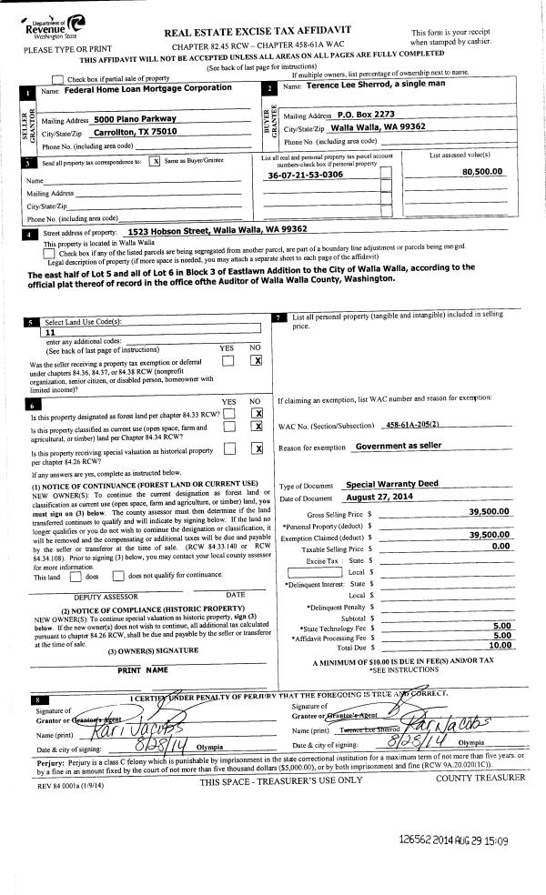 | 1 | 08/05/2014 | SWP | Special Warranty Deed | FEDERAL HOME LOAN MORTGAGE CORP | SHERROD TERENCE LEE | | | $39,500.00 | 126562 | 2014-06390 |