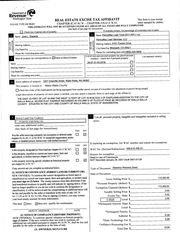 | 2 | 12/24/2014 | SWD | STATUTORY WARRANTY DEED | ESPARZA JOSE L | PENNYMAC LOANS TRUST 2011-NPL1 | | | $112,500.00 | 127180 | 2014-09386 |