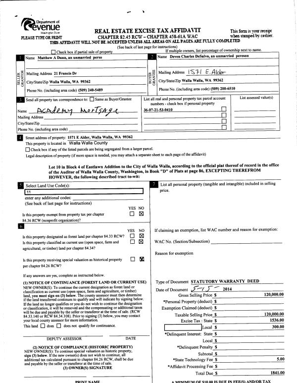 | 4 | 05/15/2014 | SWD | STATUTORY WARRANTY DEED | DUNN MATTHEW A | DESALVO DEVEN CHARLES | | | $120,000.00 | 125893 | 2014-03308 |