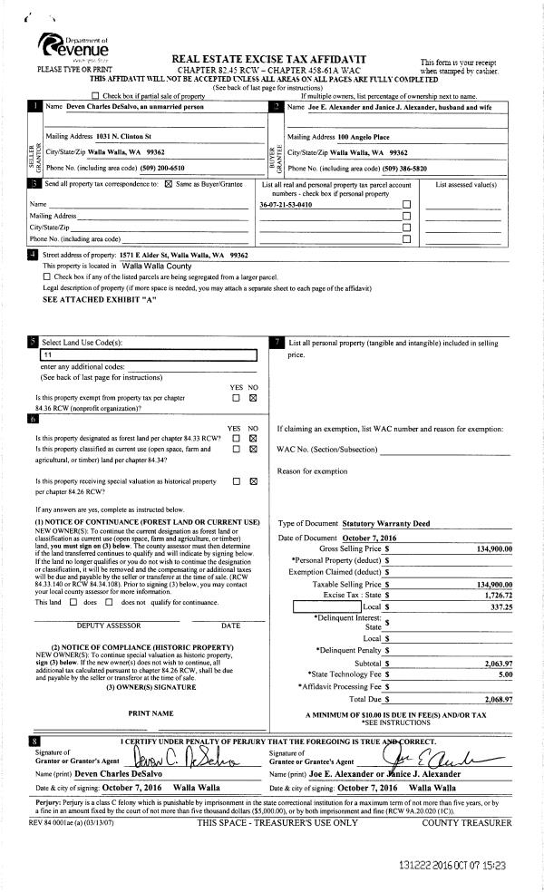 | 2 | 07/31/2017 | DPR | DEED OF PERSONAL REPRESENTATIVE | ALEXANDER JOE E & JANICE | ALEXANDER JANICE J TRUST | | | $0.00 | 132898 | 2017-05894 |