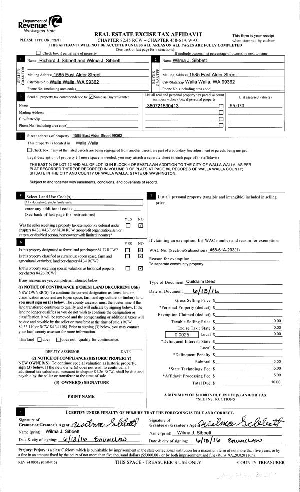 | 2 | 06/13/2016 | QCD | QUIT CLAIM DEED | SIBBETT RICHARD J & WILMA J | SIBBETT WILMA J | | | $0.00 | 130448 | 2016-04702 |