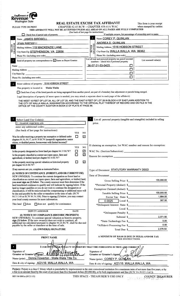 | 5 | 04/25/2016 | SWD | STATUTORY WARRANTY DEED | BIRDSELL JAMES R & JEAN L | QUINLAN COREY P & ANDREA D | | | $155,000.00 | 130093 | 2016-03055 |