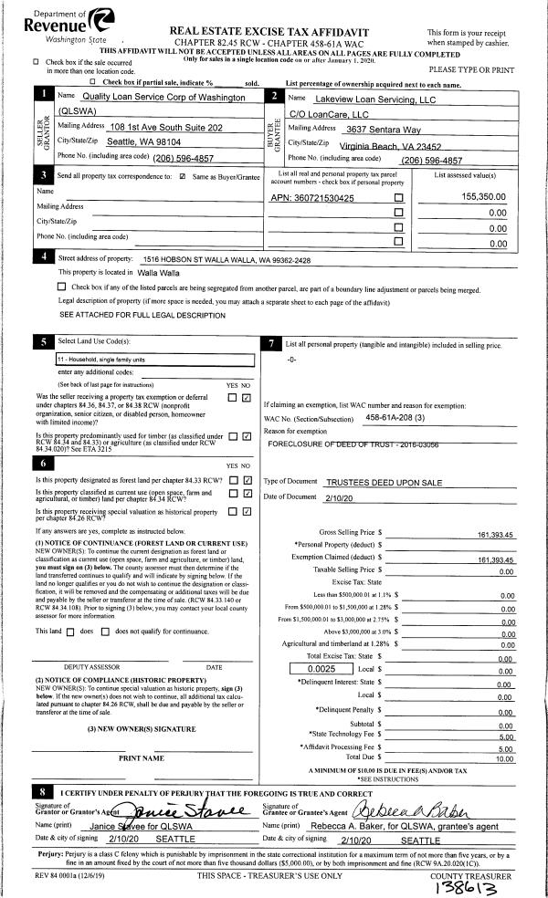 | Mailing Address: | 1516 HOBSON ST WALLA WALLA, WA 99362 | % Ownership: | 100.0000000000% |