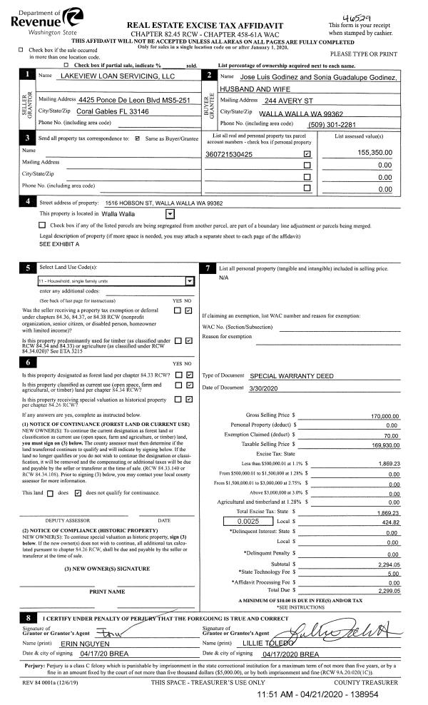| 3 | 04/21/2020 | SWP | Special Warranty Deed | LAKEVIEW LOAN SERVICING LLC | GODINEZ JOSE & SONIA GUADALUPE | | | $169,930.00 | 138954 | 2020-03376 |