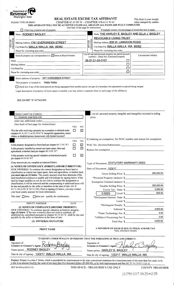 | 1 | 01/23/2017 | SWD | STATUTORY WARRANTY DEED | BAGLEY RODNEY | HARLEY E BAGLEY & ELLA J BAGLEY | | | $250,000.00 | 131799 | 2017-00577 |