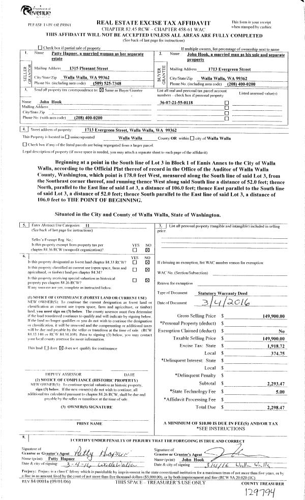 | 2 | 03/08/2016 | SWD | STATUTORY WARRANTY DEED | HAPNER PATTY | HOOK JOHN | | | $149,900.00 | 129794 | 2016-01765 |