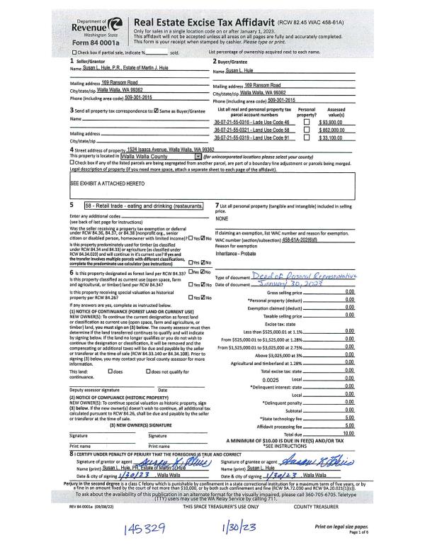 | 1 | 01/30/2023 | DPR | DEED OF PERSONAL REPRESENTATIVE | HUIE MARTIN J ESTATE OF | HUIE SUSAN L | 3-PARCELS | | $0.00 | 145329 | 2023-00463 |