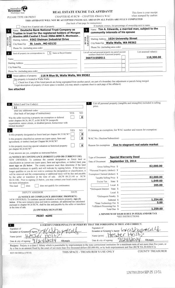 | 5 | 09/23/2014 | WARRANTY D | WARRANTY DEED | DEUTSCHE BANK NATIONAL TRUST COMPANY | EDWARDS TIM A | | | $82,000.00 | 126700 | 2014-07035 |