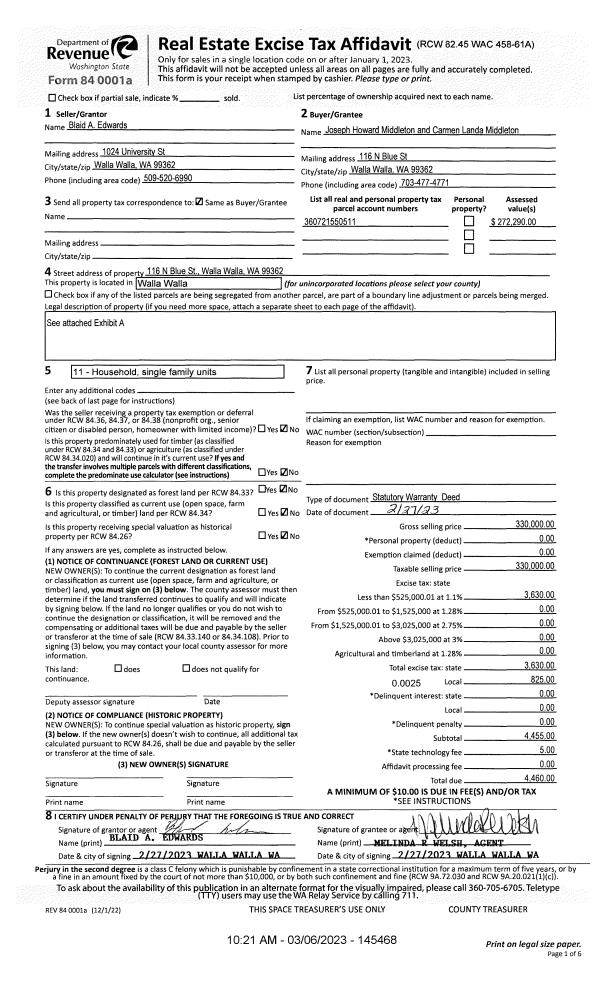 | 1 | 03/06/2023 | SWD | STATUTORY WARRANTY DEED | EDWARDS BLAID A | MIDDLETON JOSEPH HOWARD & CARMEN LANDA | | | $330,000.00 | 145468 | 2023-01126 |