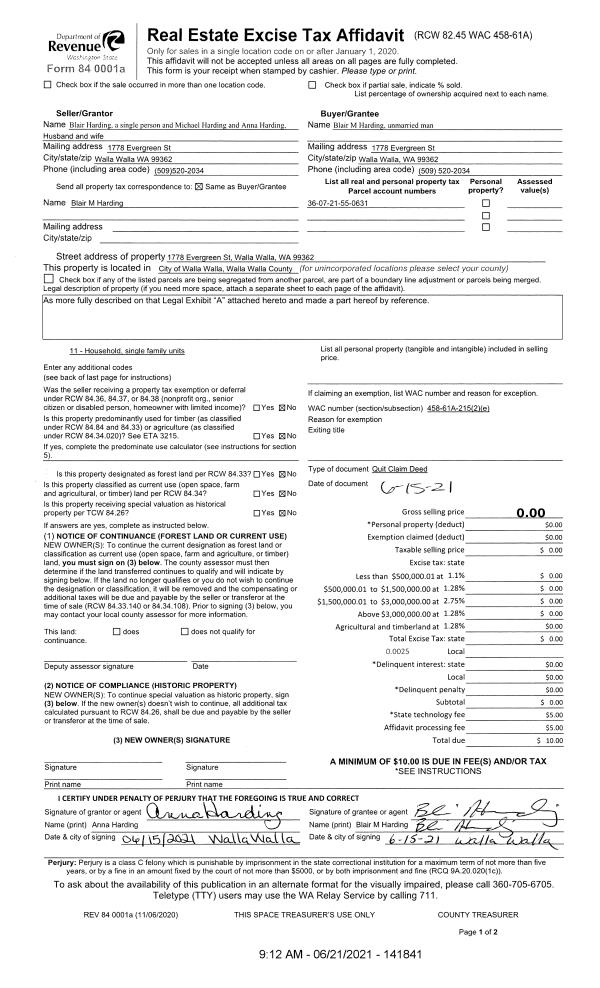 | 2 | 06/15/2021 | QCD | QUIT CLAIM DEED | HARDING BLAIR | HARDING BLAIR M | | | $0.00 | 141841 | 2021-07482 |