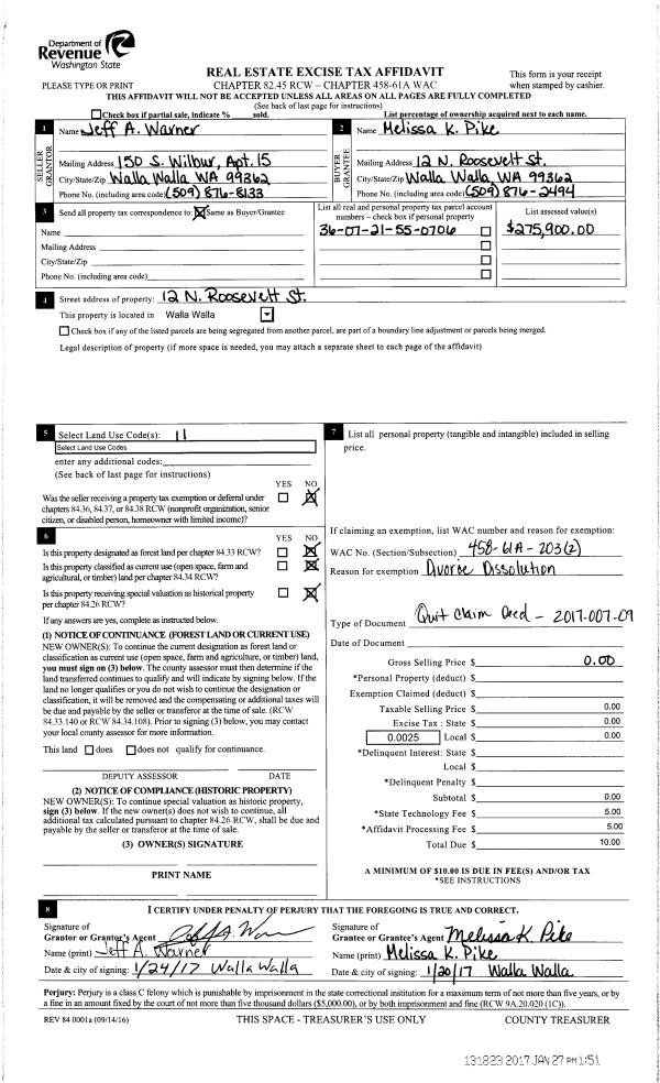 | 1 | 01/24/2017 | QCD | QUIT CLAIM DEED | WARNER JEFF A & MELISSA K | PIKE MELISSA K | | | $0.00 | 131823 | 2017-00709 |