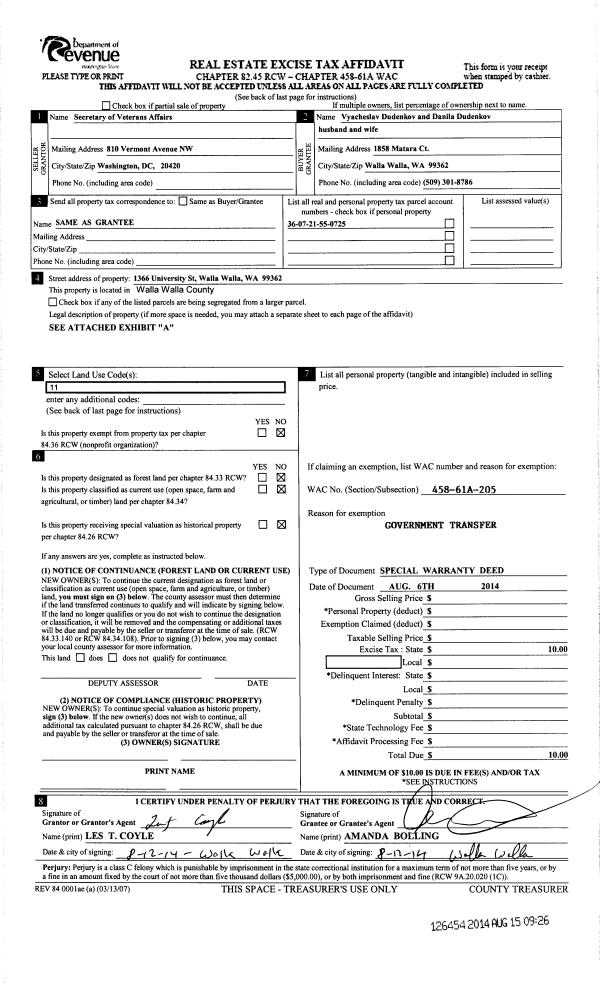 | 3 | 08/06/2014 | SWP | Special Warranty Deed | THE SECRETARY OF VETERANS AFFAIRS | DUDENKOV VYACHESLAV & DANILA | | | $65,000.00 | 126454 | 2014-05879 |