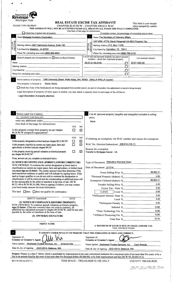 | 4 | 02/25/2014 | SWD | STATUTORY WARRANTY DEED | MORTGAGE INVESTORS CORPORATION | THE SECRETARY OF VETERANS AFFAIRS | | | $88,983.00 | 125471 | 2014-01340 |