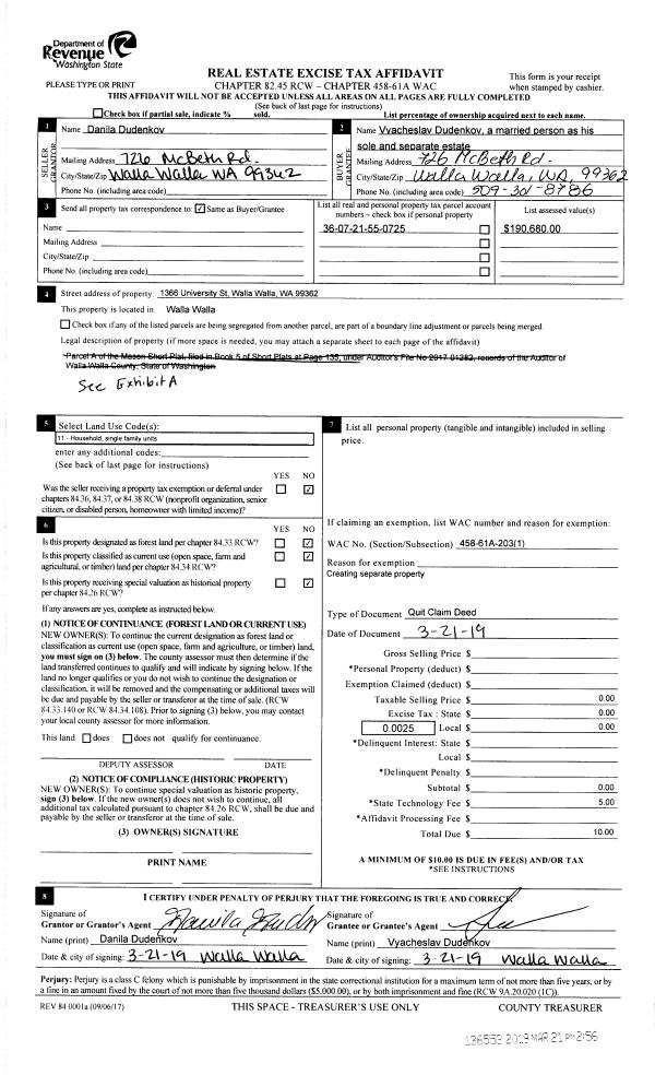 | 1 | 03/21/2019 | QCD | QUIT CLAIM DEED | DUDENKOV VYACHESLAV & DANILA | DUDENKOV VYACHESLAV | | | $0.00 | 136553 | 2019-01793 |