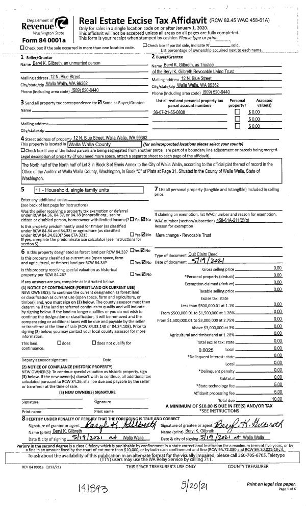 | 1 | 05/19/2021 | QCD | QUIT CLAIM DEED | GILBRETH BERYL K | GILBRETH BERYL K REVOCABLE LIVING TRUST | | | $0.00 | 141593 | 2021-06120 |