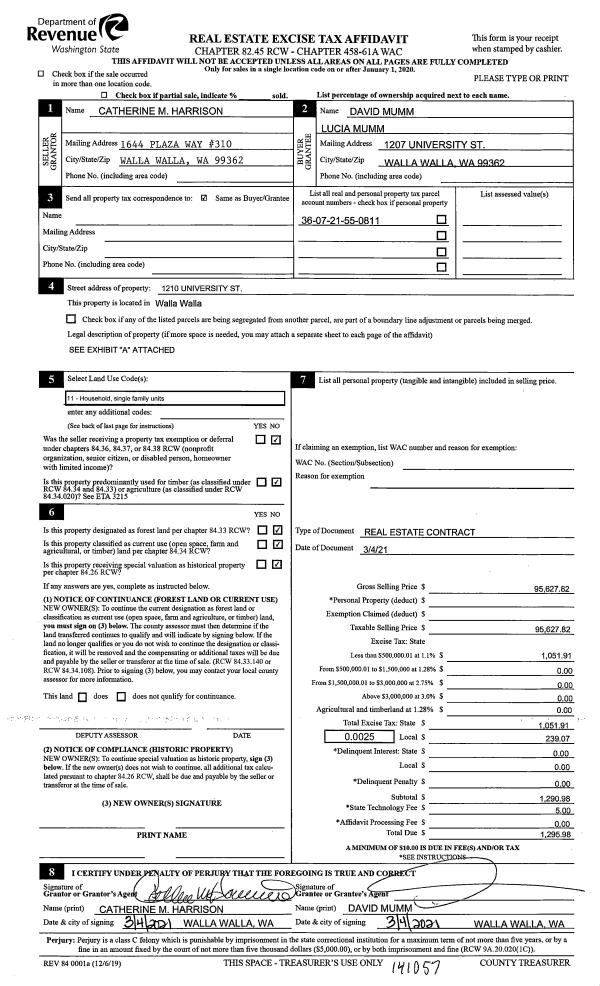 | 1 | 03/05/2021 | REAL ESTAT | REAL ESTATE CONTRACT | HARRISON CATHERINE M | MUMM DAVID & LUCIA | | | $95,628.00 | 141057 | 2021-02553 |