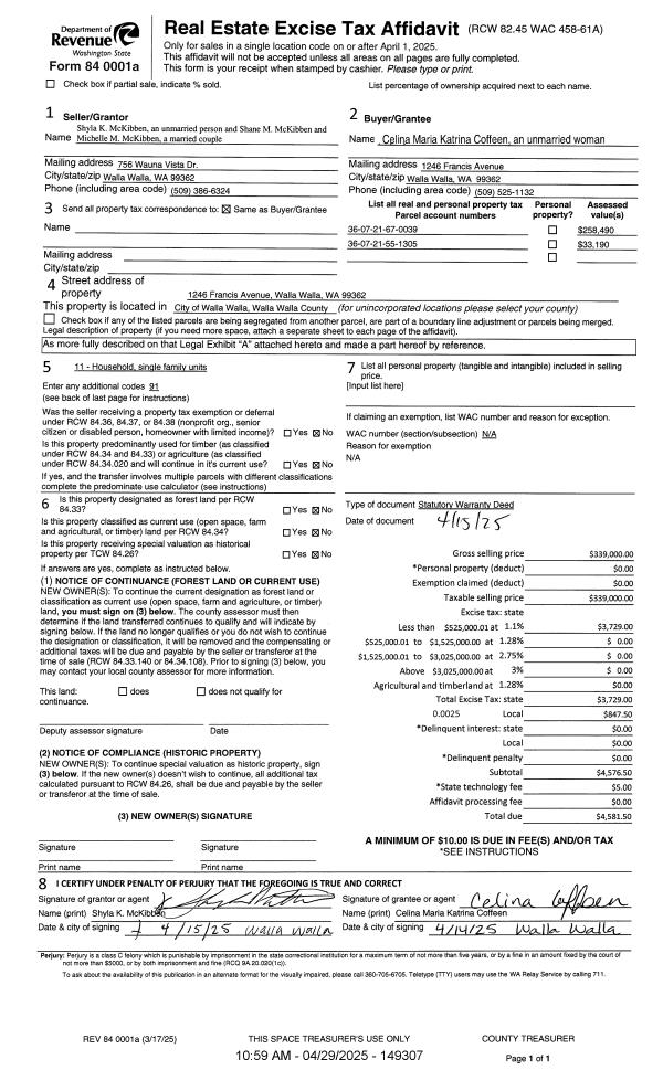 | Mailing Address: | SHANE M & MICHELLE M MCKIBBEN 1246 FRANCIS AVE WALLA WALLA, WA 99362 | % Ownership: | 100.0000000000% |