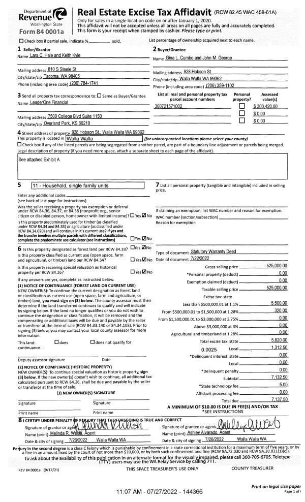| 1 | 07/27/2022 | SWD | STATUTORY WARRANTY DEED | HALE C LARA | CUMBO GINA L & JOHN M GEORGE | | | $525,000.00 | 144366 | 2022-06268 |