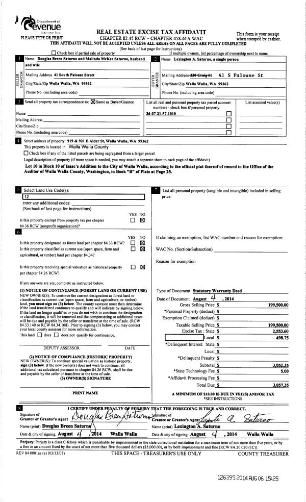 | 2 | 08/06/2014 | SWD | STATUTORY WARRANTY DEED | SATURNO DOUGLAS B & MALINDA M | SATURNO LEXINGTON A | | | $199,500.00 | 126395 | 2014-05599 |