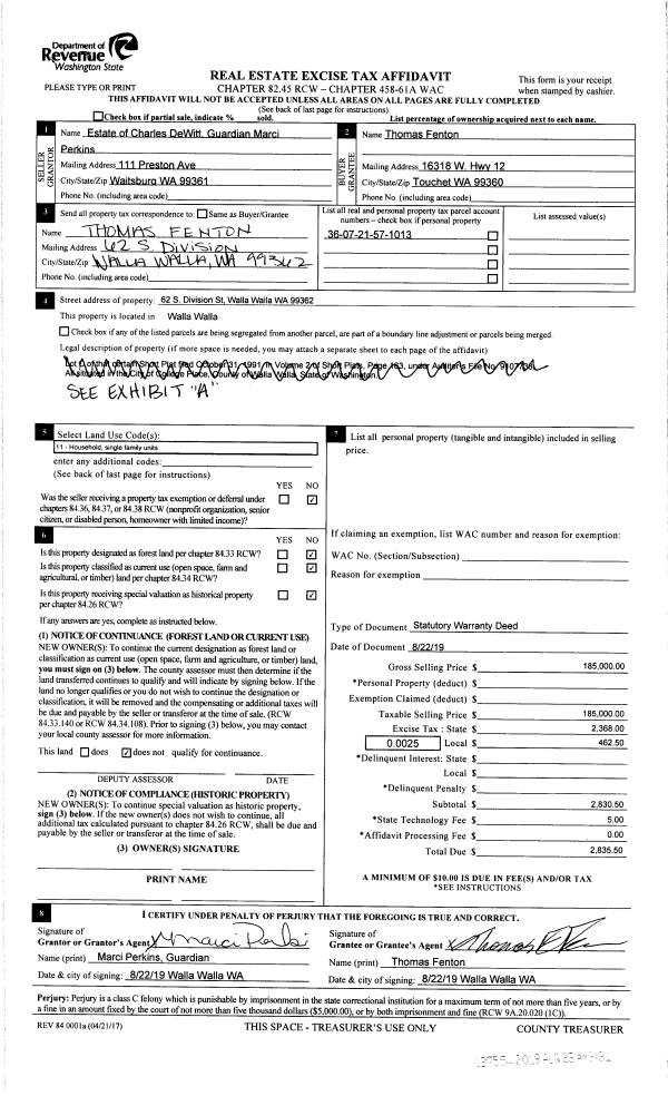 | 2 | 08/23/2019 | SWD | STATUTORY WARRANTY DEED | DEWITT CHARLES DAWSON ESTATE OF | FENTON THOMAS | | | $185,000.00 | 137554 | 2019-06527 |
