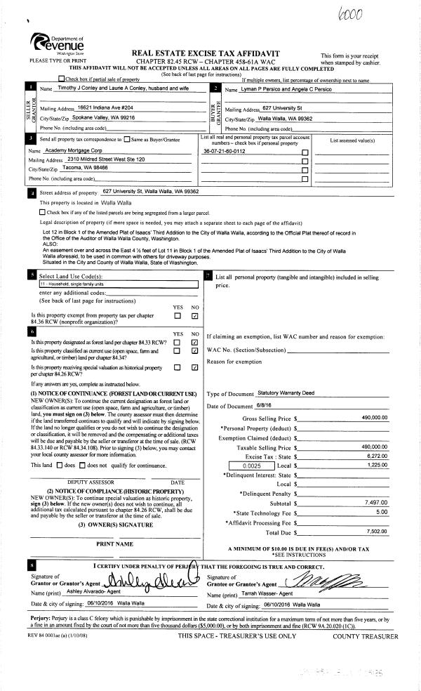 | 1 | 06/10/2016 | SWD | STATUTORY WARRANTY DEED | CONLEY TIMOTHY J & LAURIE A | PERSICO LYMAN P & ANGELA C | | | $490,000.00 | 130395 | 2016-04397 |