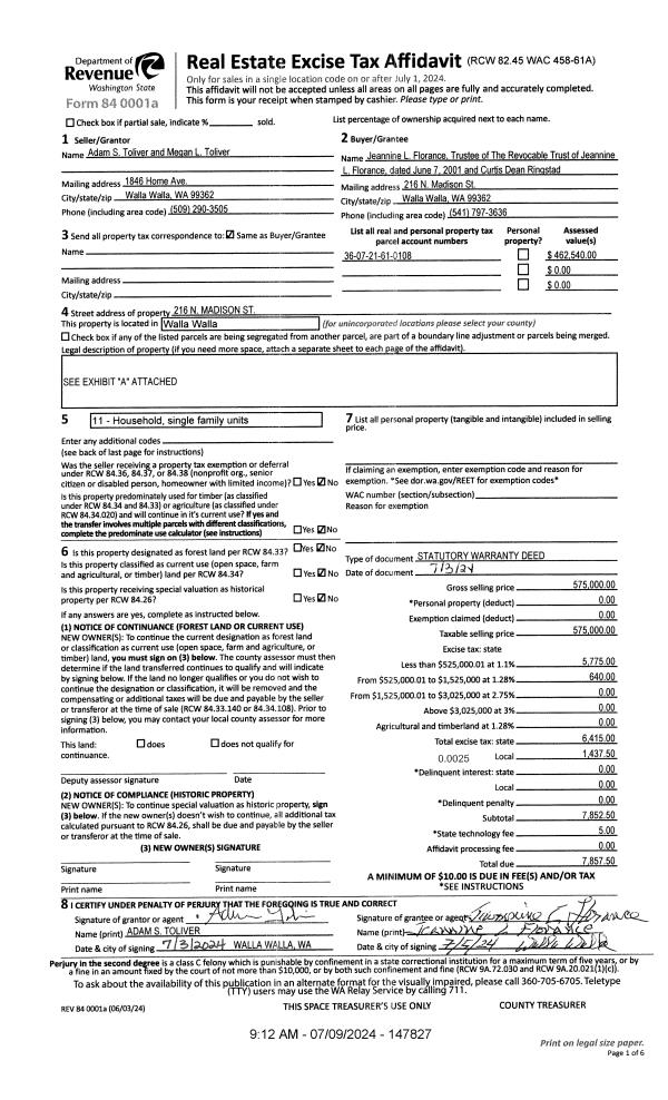 | 1 | 07/09/2024 | SWD | STATUTORY WARRANTY DEED | TOLIVER ADAM S & MEGAN L | REVOCABLE TRUST OF JEANNINE L FLORANCE | | | $575,000.00 | 147827 | 2024-03656 |