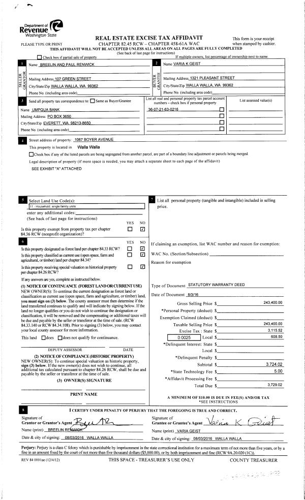 | 4 | 08/04/2016 | SWD | STATUTORY WARRANTY DEED | RENWICK PAUL & BREELIN | GEIST VARIA K | | | $243,400.00 | 130769 | 2016-06153 |
