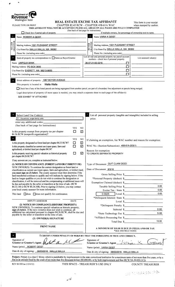 | 3 | 08/04/2016 | QCD | QUIT CLAIM DEED | GEIST ROBERT A | GEIST VARIA K | | | | 130770 | 2016-06154 |