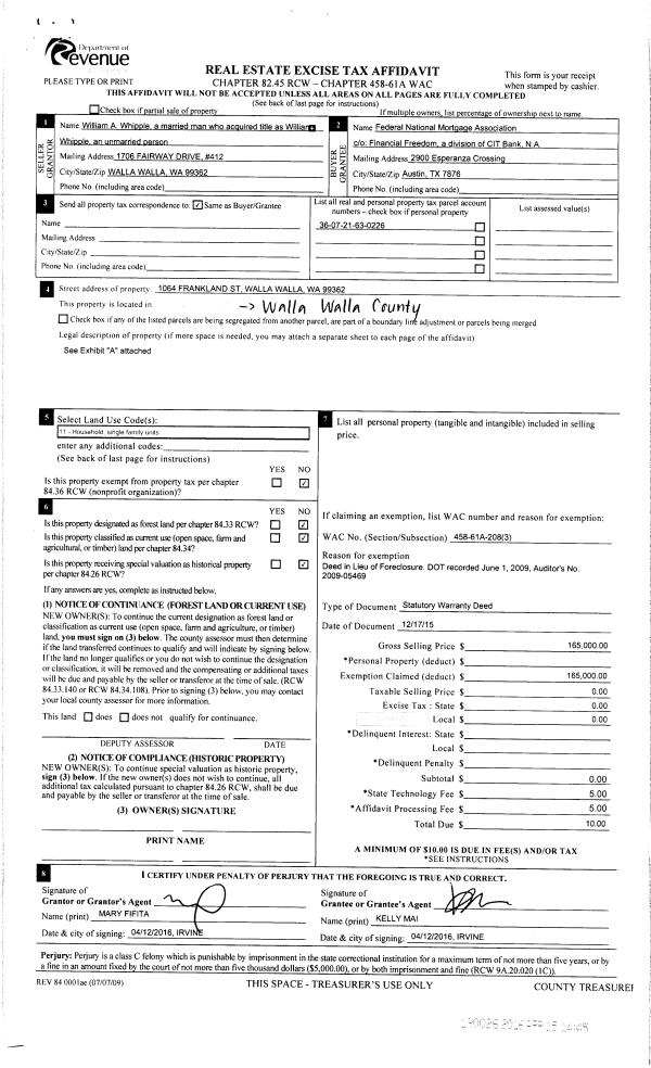 | 2 | 04/15/2016 | SWD | STATUTORY WARRANTY DEED | WHIPPLE WILLIAM A & LYDIA A | FEDERAL NATIONAL MORTGAGE ASSOC | | | $165,000.00 | 130026 | 2016-02765 |