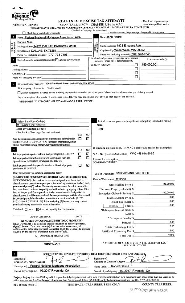 | 1 | 01/06/2017 | BARGAIN & | BARGAIN & SALE DEED | FEDERAL NATIONAL MORTGAGE ASSOC | HEARD JOHN | | | $140,000.00 | 131728 | 2017-00154 |