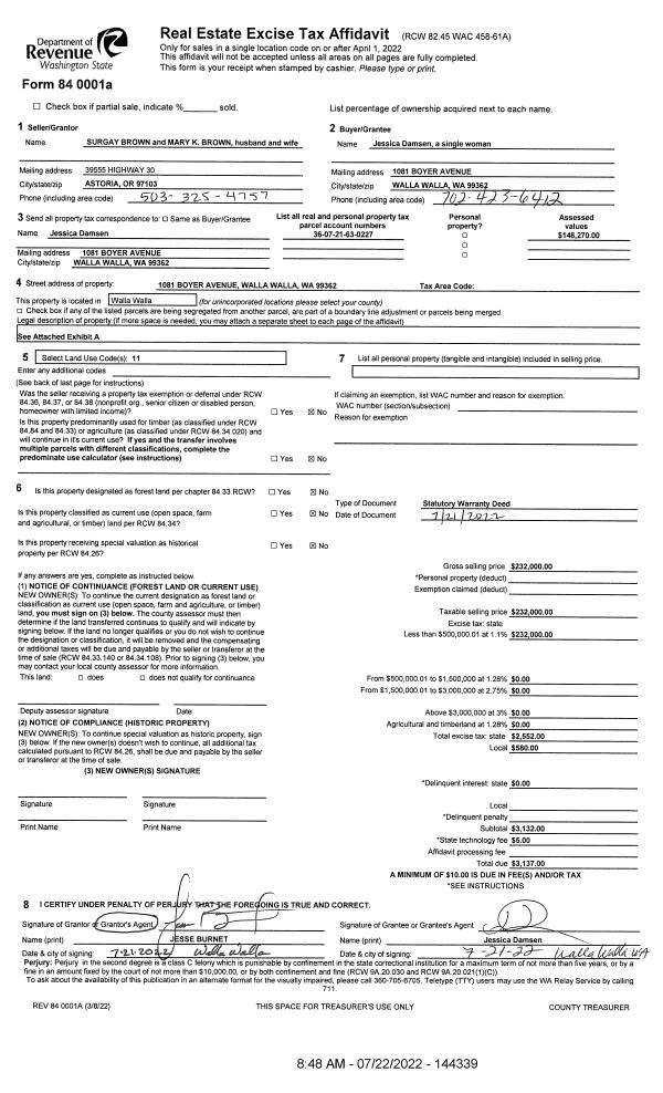 | 1 | 07/22/2022 | SWD | STATUTORY WARRANTY DEED | BROWN SURGAY & MARY K | DAMSEN JESSICA | | | $232,000.00 | 144339 | 2022-06153 |