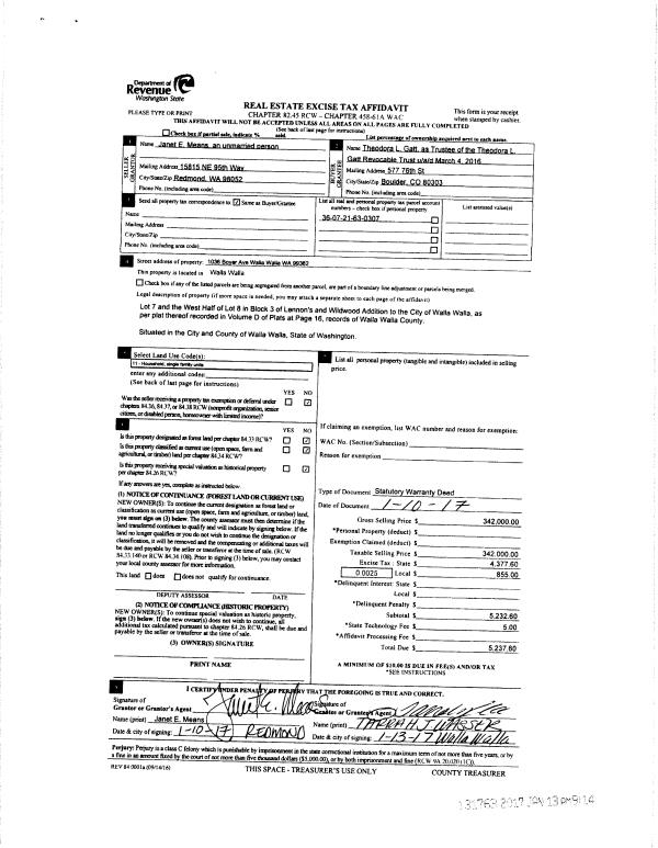 | 1 | 01/13/2017 | SWD | STATUTORY WARRANTY DEED | MEANS JANET E | THEODORA L GATT REVOCABLE TRUST | | | $342,000.00 | 131763 | 2017-00342 |