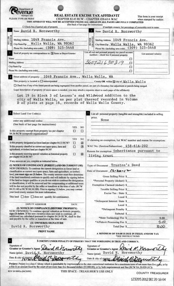 | 5 | 12/20/2012 | WARRANTY D | WARRANTY DEED | NORSWORTHY, DAVID R & CLAIRE | NORSWORTHY, DAVID R | | | $0.00 | 123205 | 2012-11383 |