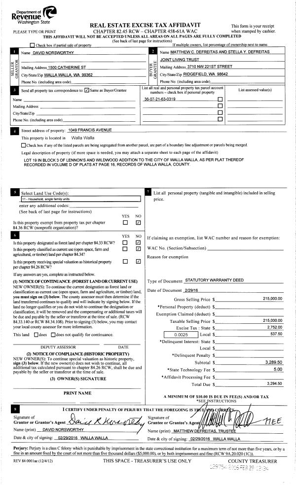 | 4 | 02/29/2016 | SWD | STATUTORY WARRANTY DEED | NORSWORTHY DAVID R | MATTHEW C DEFREITAS & STELLA Y DEFREITAS JOINT LIVING TRUST | | | $215,000.00 | 129754 | 2016-01505 |