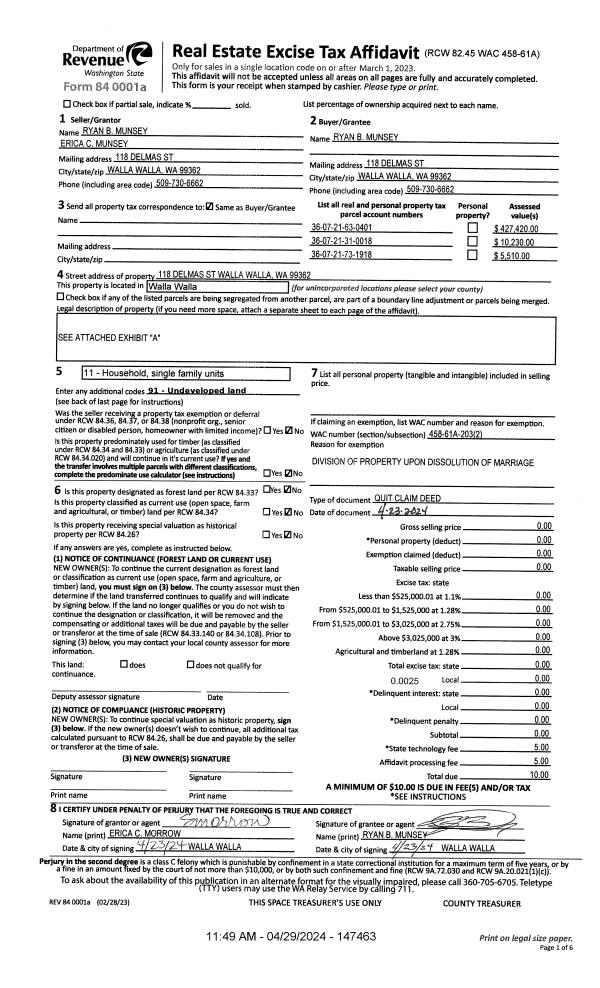 | 2 | 04/29/2024 | QCD | QUIT CLAIM DEED | MUNSEY RYAN & ERICA C | MUNSEY RYAN B | | | | 147463 | 2024-02170 |