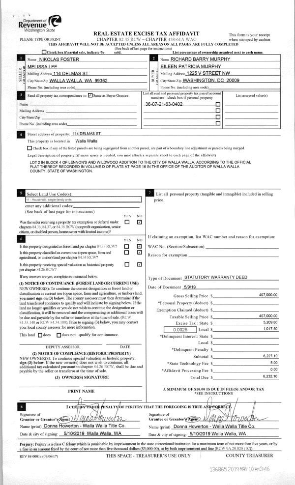 | 1 | 05/10/2019 | SWD | STATUTORY WARRANTY DEED | FOSTER NIKOLAS | MURPHY RICHARD BARRY & EILEEN PATRICIA | | | $407,000.00 | 136865 | 2019-03109 |