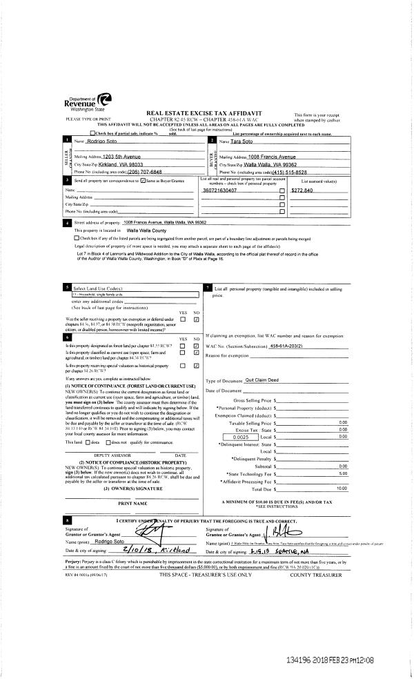 | 3 | 02/19/2018 | QCD | QUIT CLAIM DEED | SOTO RODRIGO & TARA | SOTO TARA | | | $0.00 | 134196 | 2018-01493 |